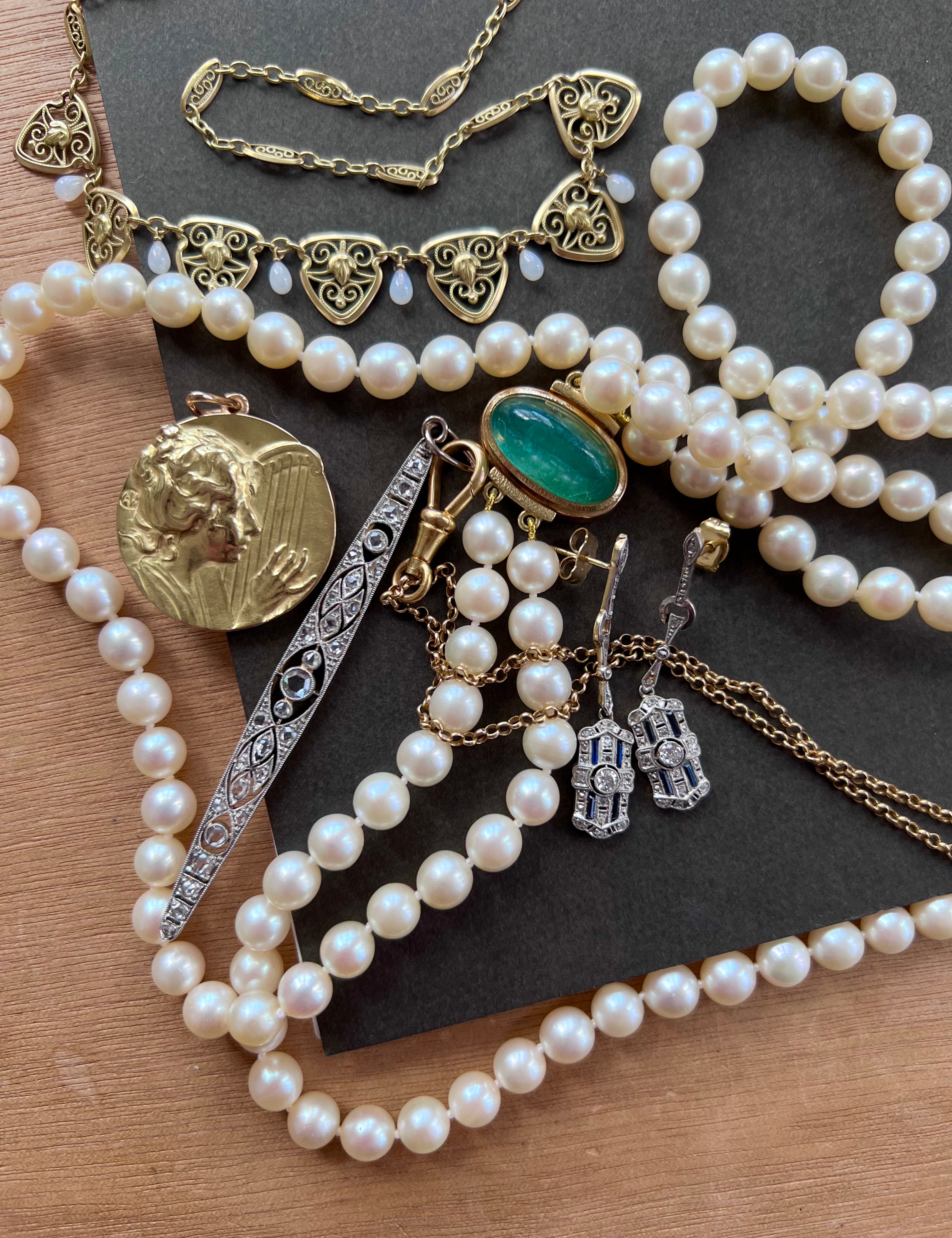 Vintage Akoya Pearl Necklace with 18ct Gold Cabochon Emerald Clasp