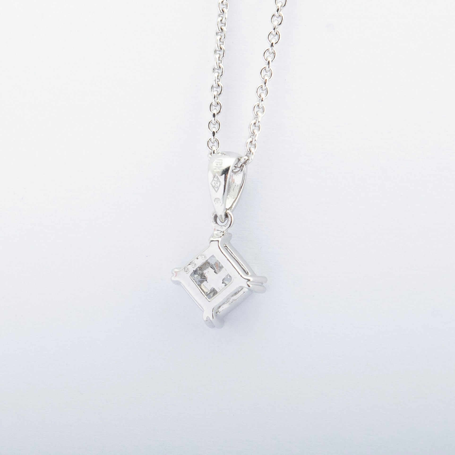A pretty vintage square pendant made in 18ct white gold set with bright white princess cut diamonds in an invisible setting. In perfect condition, a contemporary and elegant pendant for daily wear.