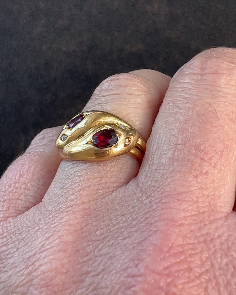 A beautiful 18ct gold entwined double snake ring, dating circa 1900. The snakes heads are set with a garnet and rose diamond eyes, their body coiled and complete with their tails. Snake rings were popular in the Georgian, Victorian and Edwardian eras and signify eternal love, renewal and protection. This ring is in good condition with a lovely buttery gold patina. Stamped with British hallmarks. Looks fabulous on the hand and easy to wear, a statement piece.