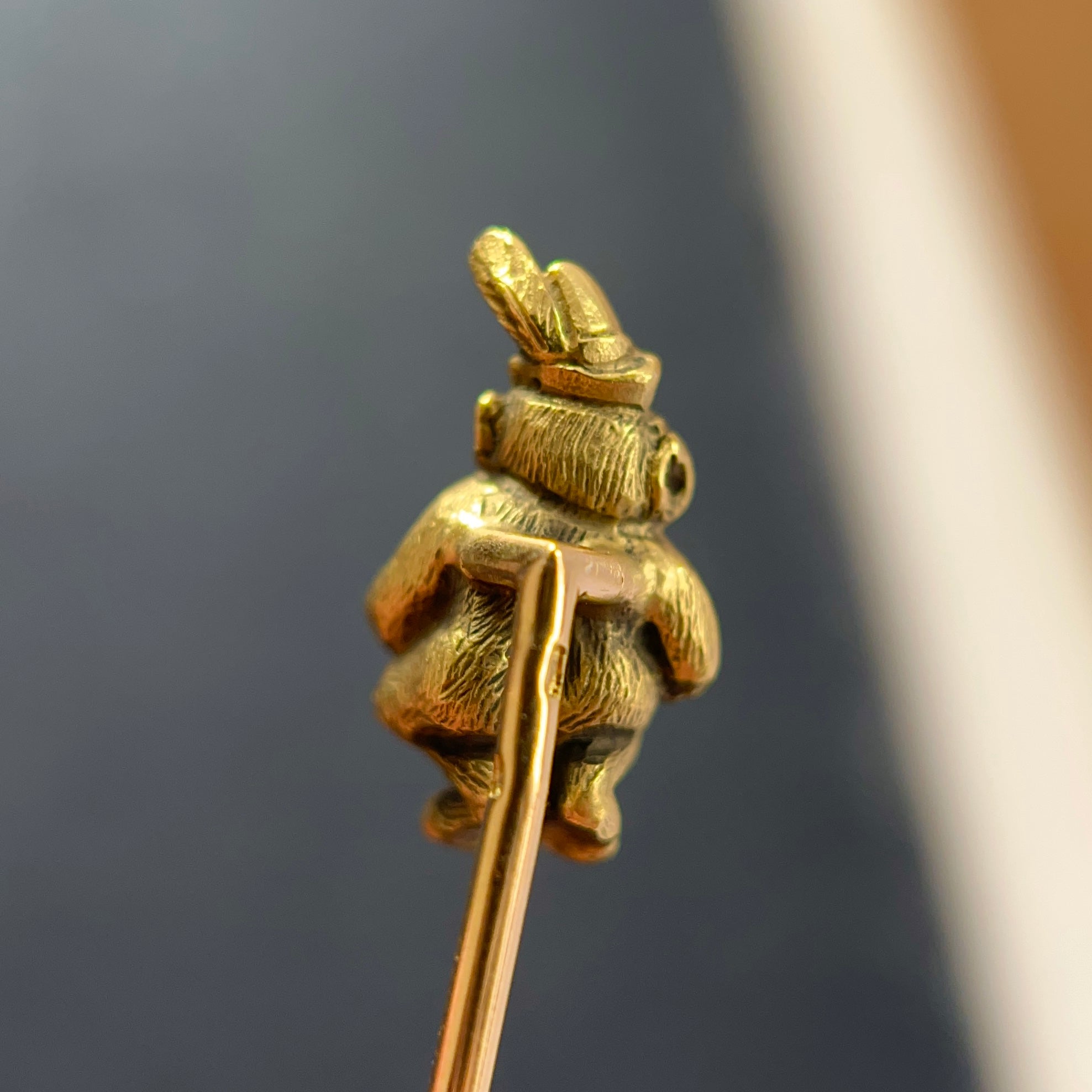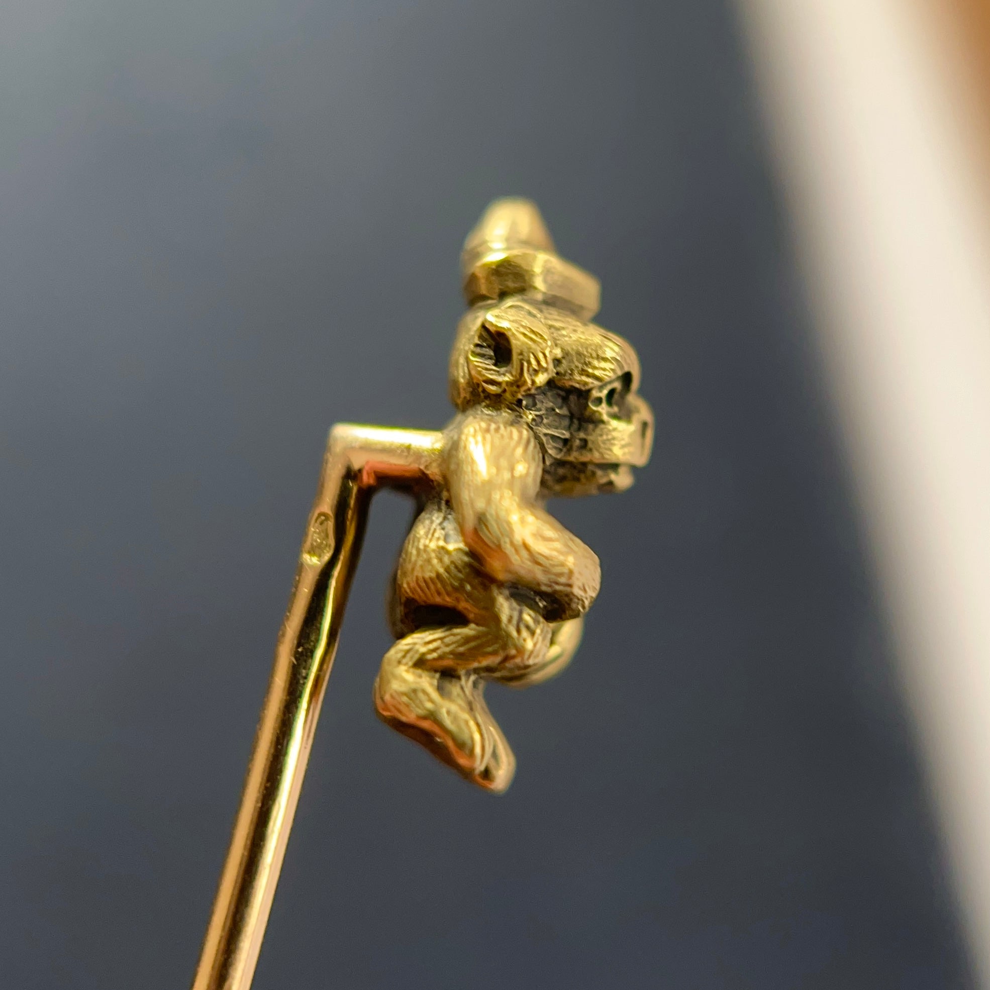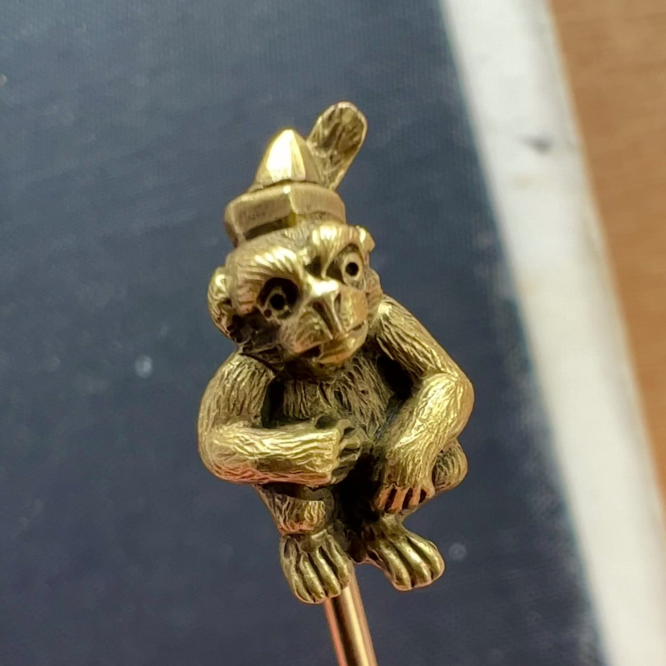 Charming Antique Victorian monkey stick pin, dating circa 1880s, handcrafted in 18k yellow gold. It features a very finely detailed and textured monkey wearing a hat with a feather. This playful piece, full of personality, captures the spirit of the late Victorian jewellery and its symbolism, the monkey was regarded in ancient cultures as an intelligent and wise animal.