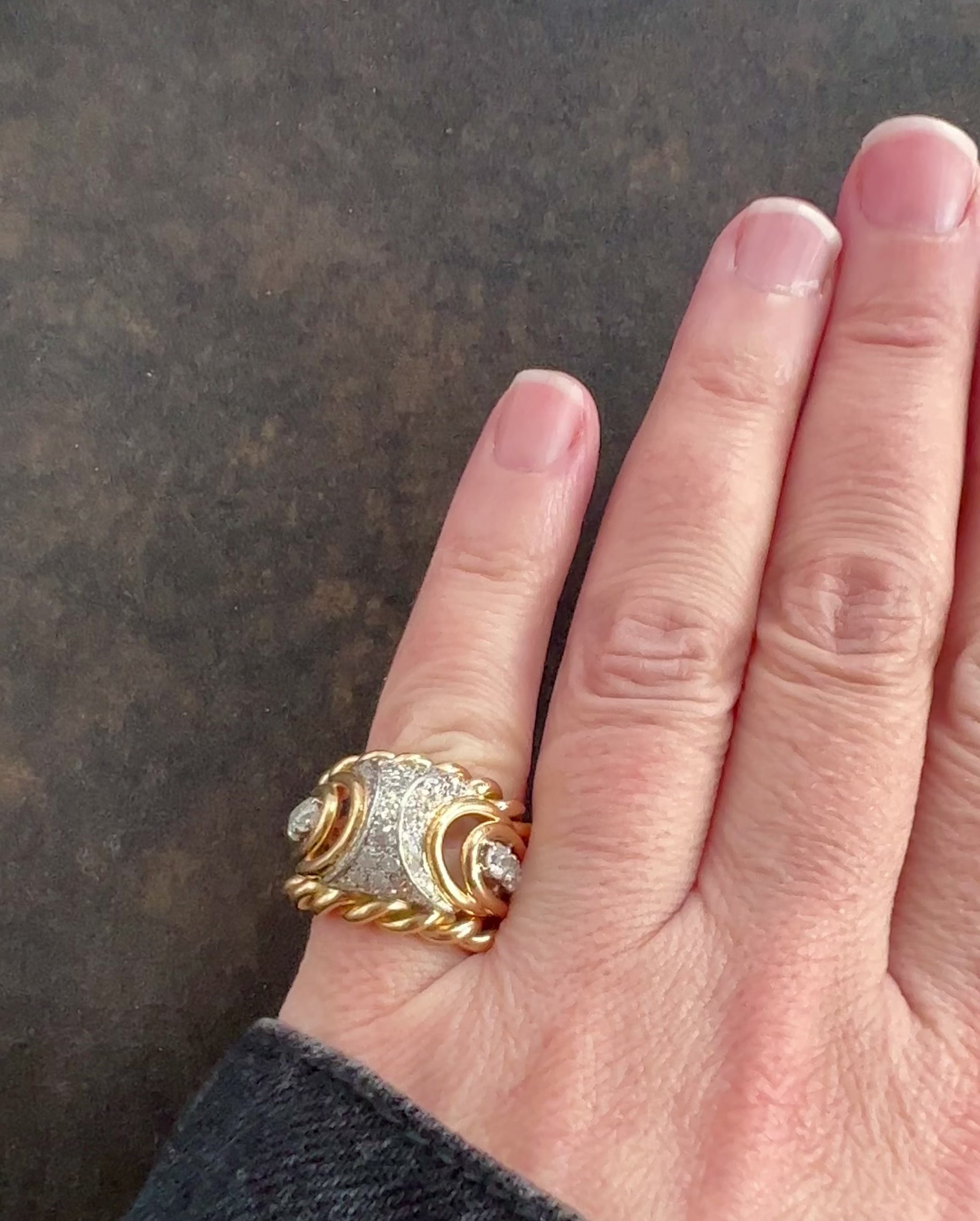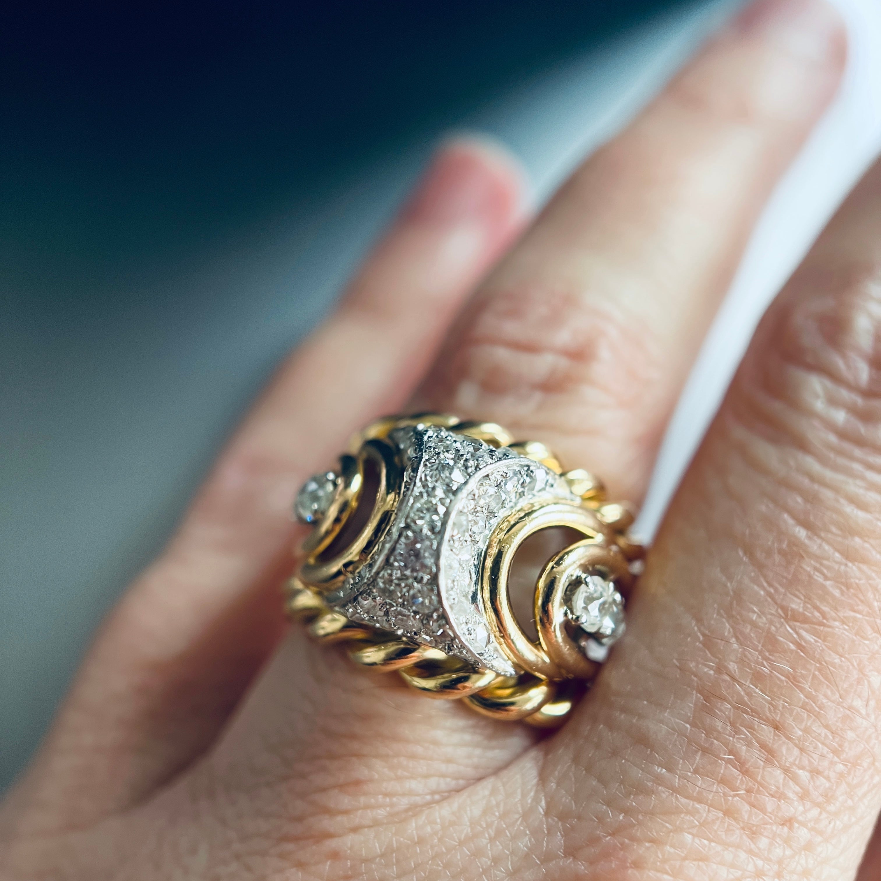 Stunning Retro ring, dating circa 1940s, made in 18ct yellow gold and Platinum in a two tone geometrical design with twisted gold wire and a domed centrepiece pave set with 21 old cut diamonds and 22 rose cut diamonds, the shoulders are further set with 4 old cut diamonds. The total carat weight is approx. 1.50 carats. This unique ring looks marvellous on the pinky finger.
