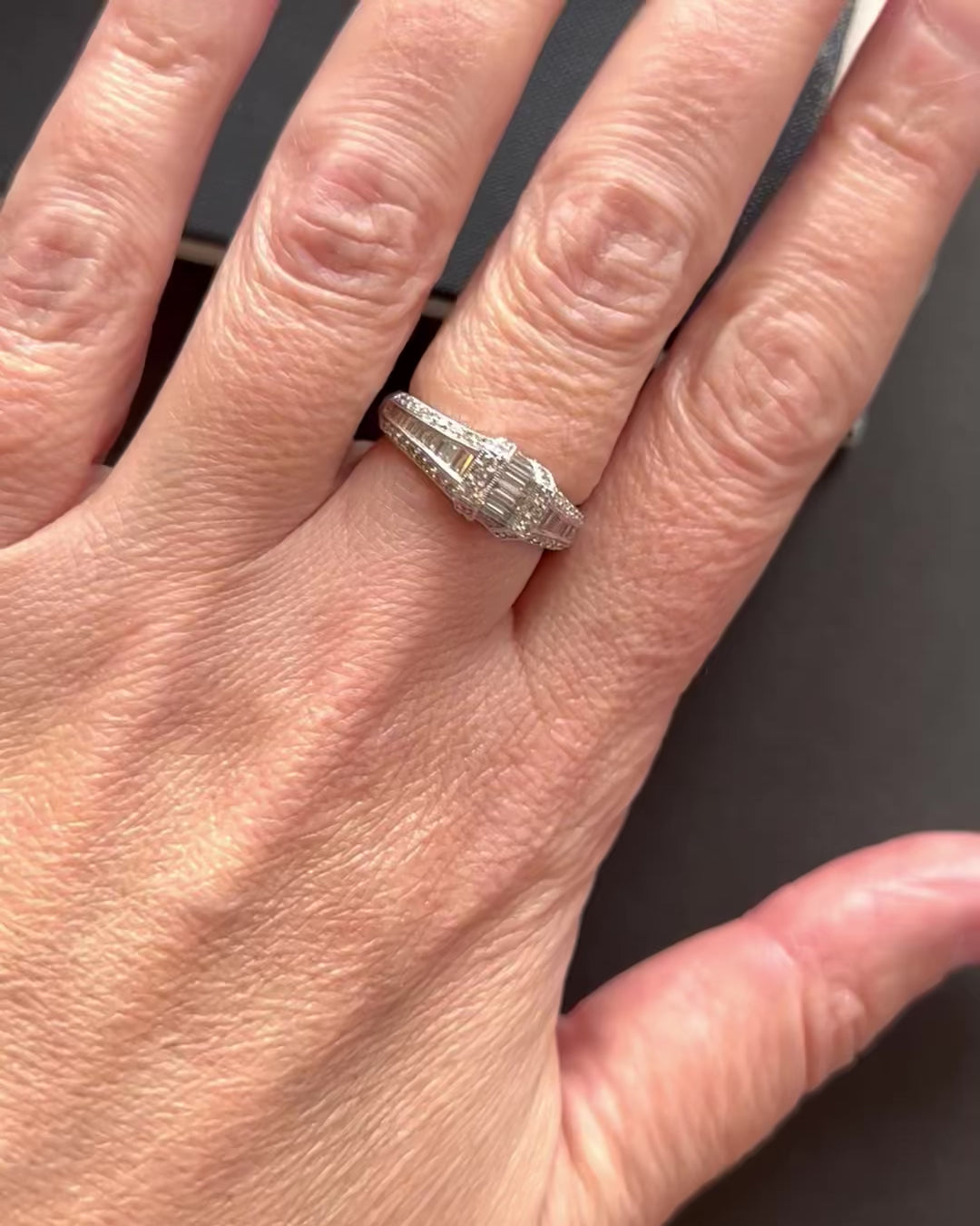 Vintage diamond ring, in a classic timeless design, made in 18ct white gold, set with bright white baguette and brilliant cut diamonds totalling 1ctw. Would make a pretty engagement ring, anniversary ring or cocktail ring. In excellent condition.
