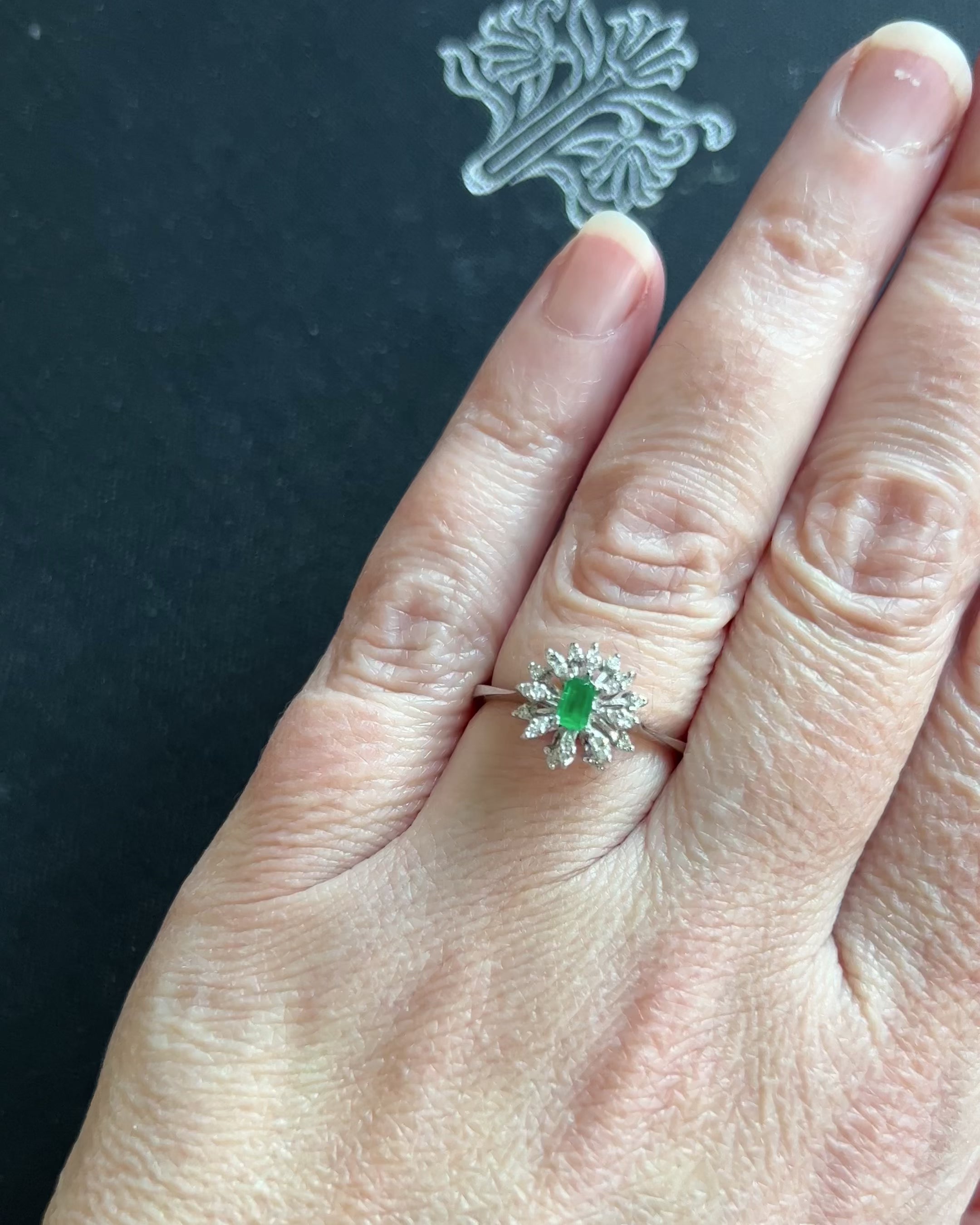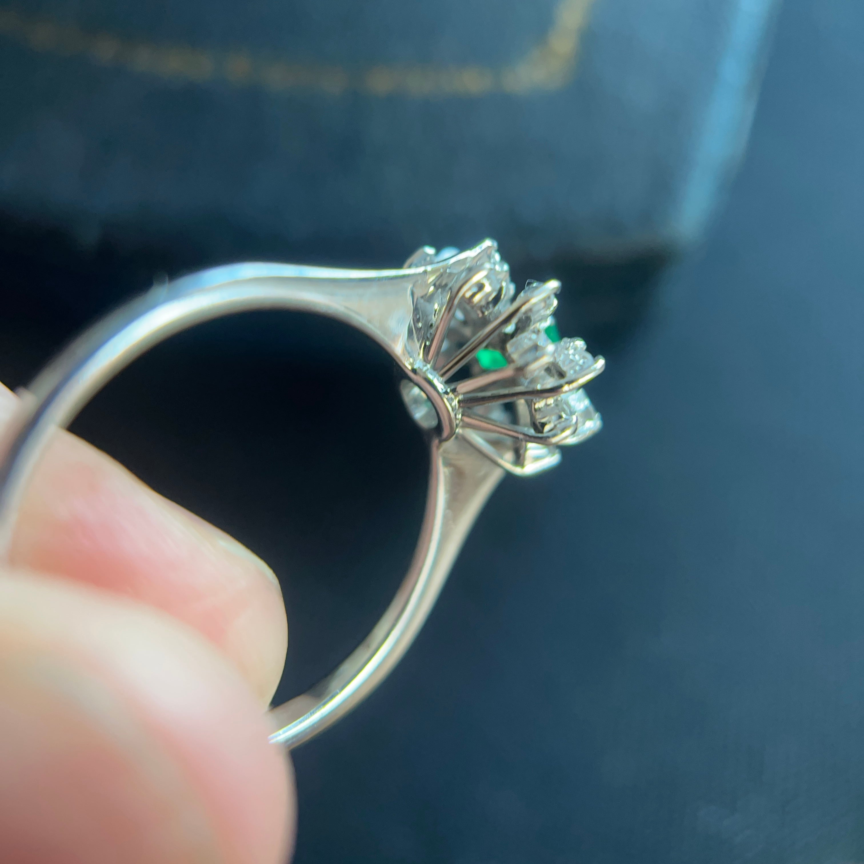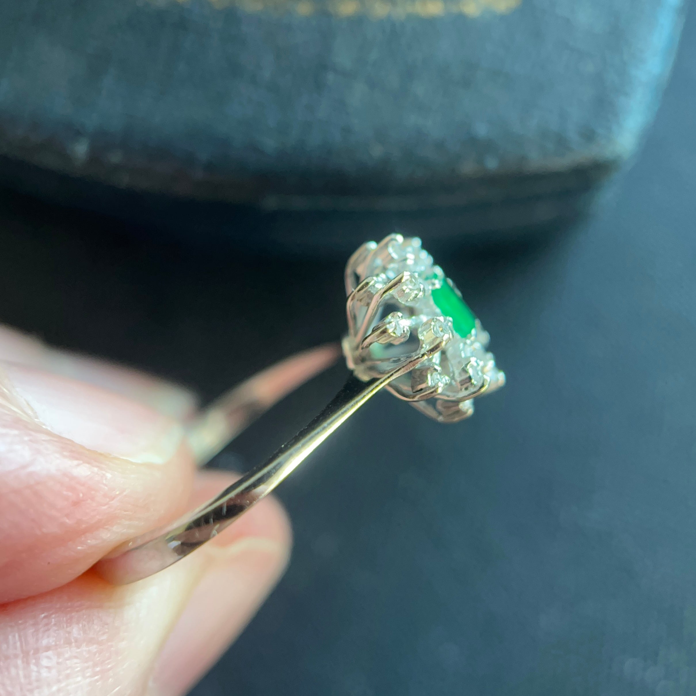 Elegant diamond ring in a pretty flower cluster design, dating circa 1970s, made in 18ct white gold, set with a central natural green aventurine and 24 bright single cut diamonds weighing combined approx. 0.25ct. This ring is in excellent condition, and looks fabulous on the hand.