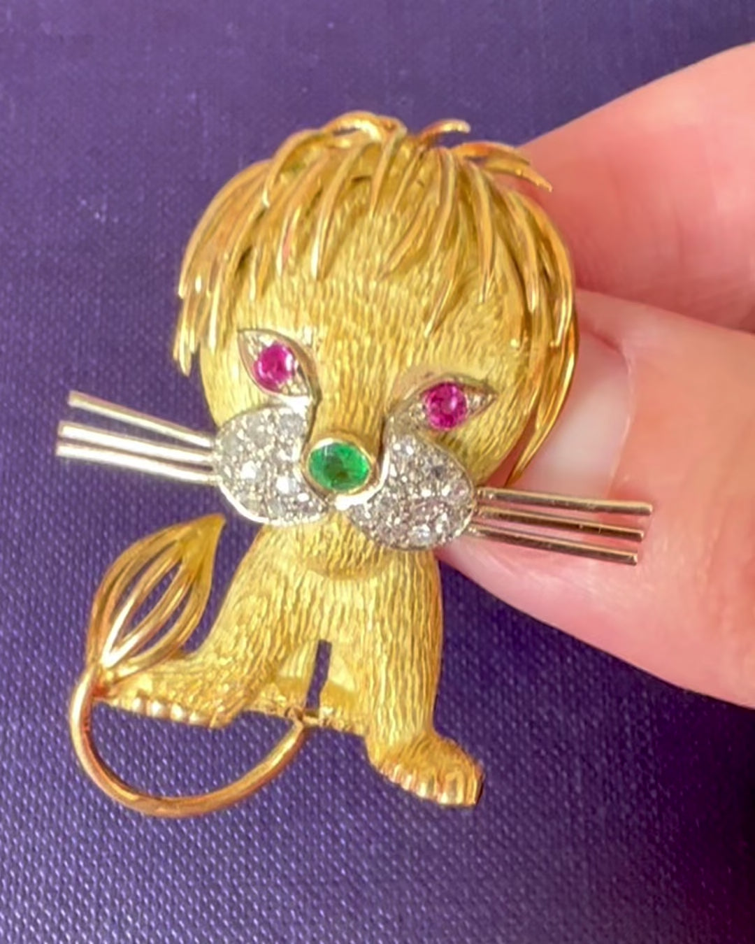 Charming Vintage Lion Brooch, made circa 1970 in the style of Van Cleef & Arpel’s famous "Dishevelled Lion" brooch. Finely detailed, the snout features 20 single cut diamonds, the eyes are set with round cut rubies and the nose with a round cut emerald.