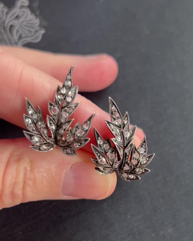 Antique Victorian earrings, dating circa 1850s, in floral leaf motif, encrusted with 51 glistening rose diamonds. They are made in silver with 18k gold clips at the back that are a later adaptation. In very good condition, a charming pair of earrings.