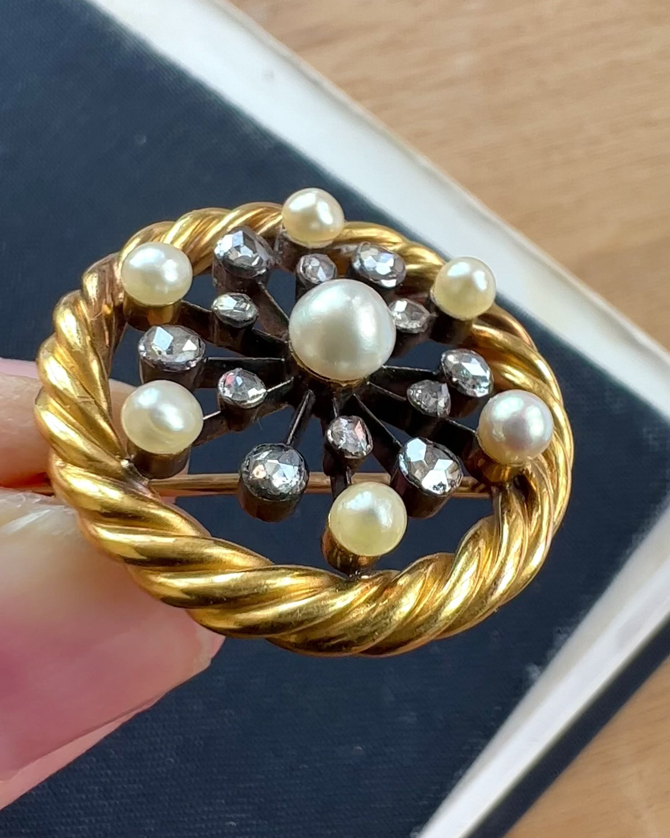 A very pretty Antique Victorian star brooch, dating circa 1870s, made in 18ct yellow gold and silver, set with with 7 lustrous natural pearls (not lab tested) and 12 high domed glistering rose-cut diamonds in closed back silver collet setting. The pretty diamond and pearl star sits in a beautiful gold twisted rope frame. In very good condition, oozing antique charm.