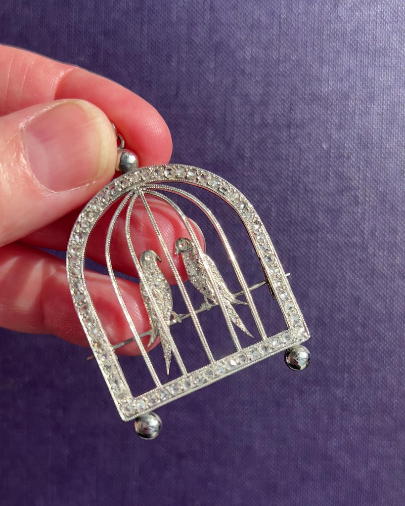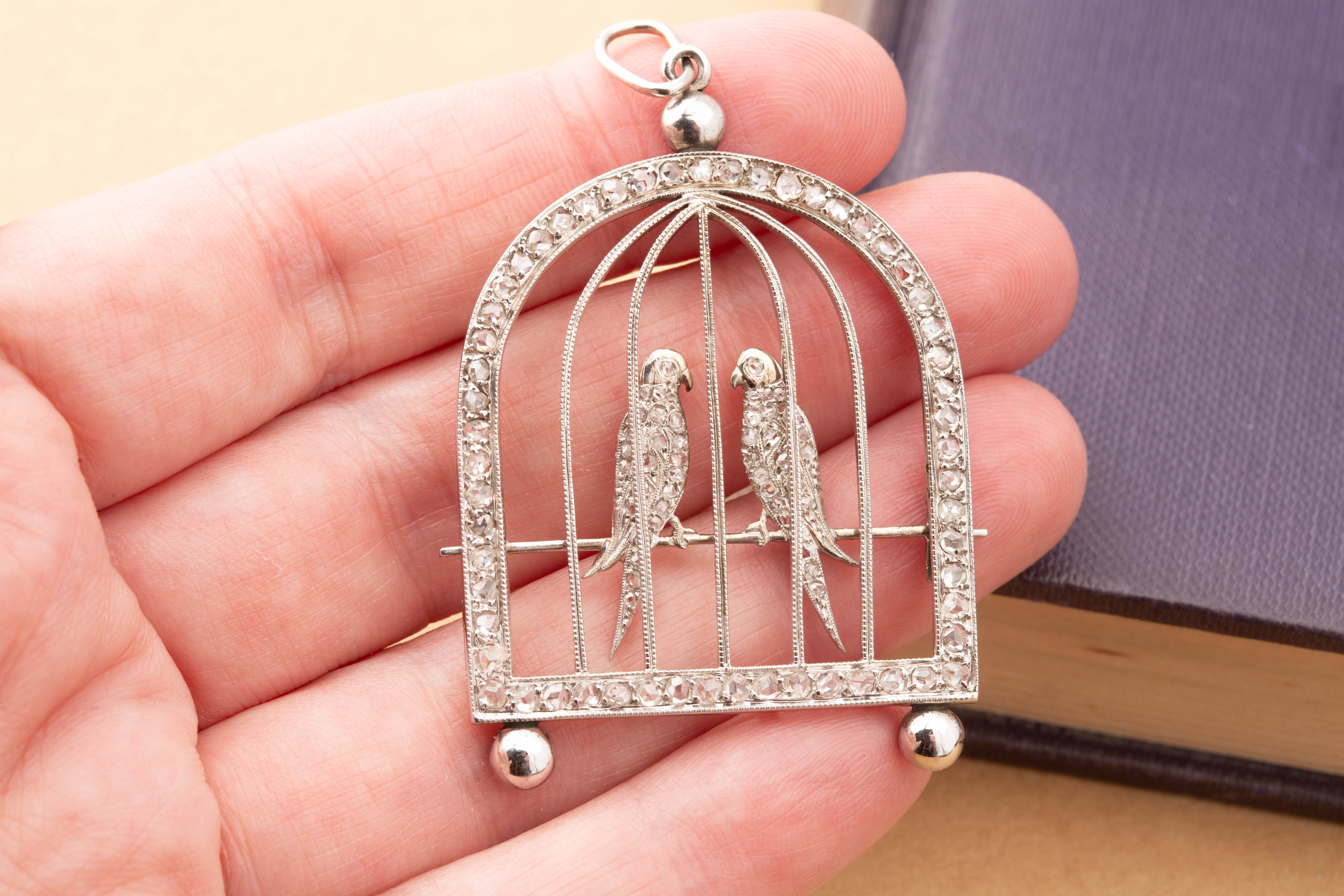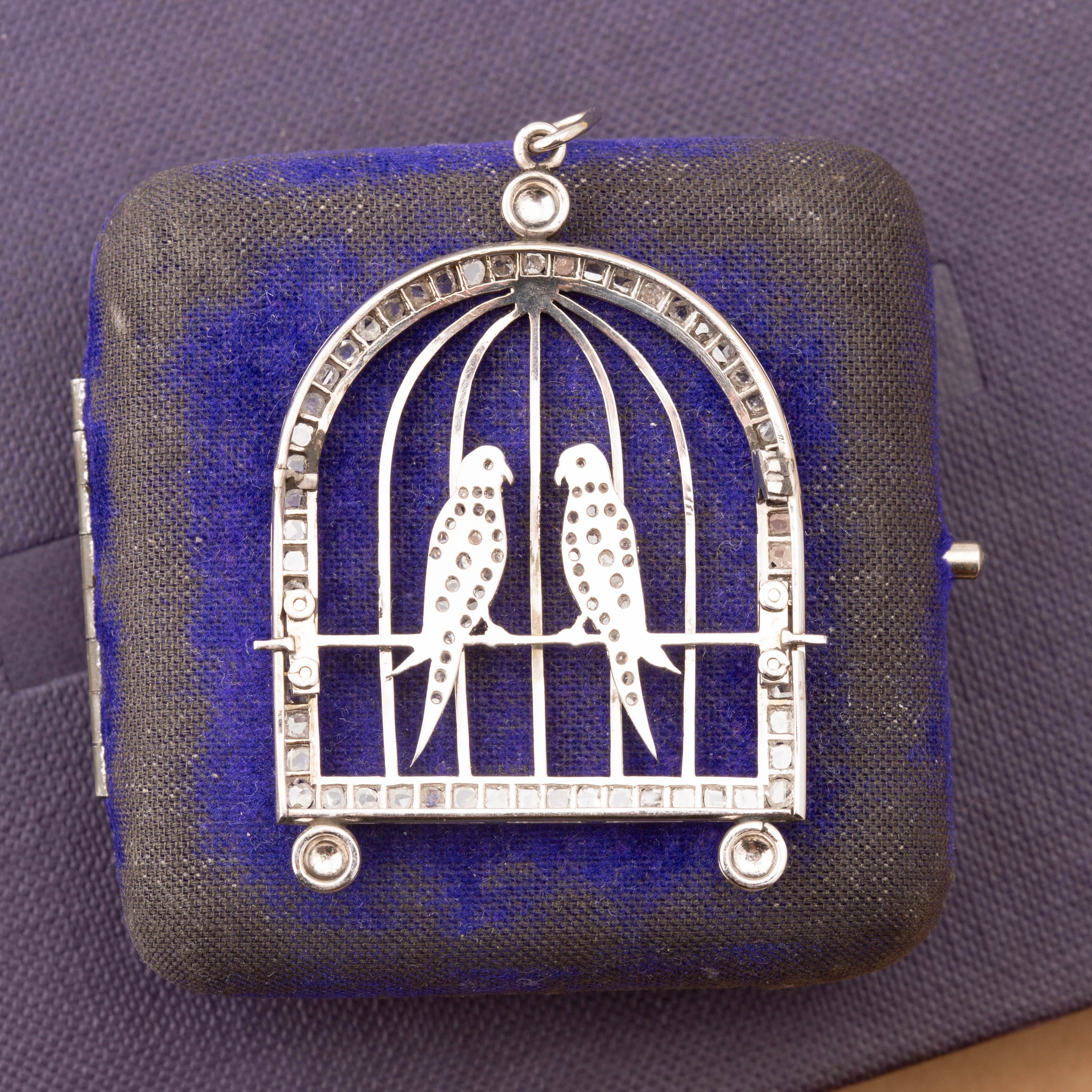 Unique love birds in a cage pendant, dating circa 1970s, made in 18ct white gold, set throughout with 97 white and bright, high domed rose cut diamonds, weighing approx. 1.30 carats. In very good condition, a lovely and original piece.