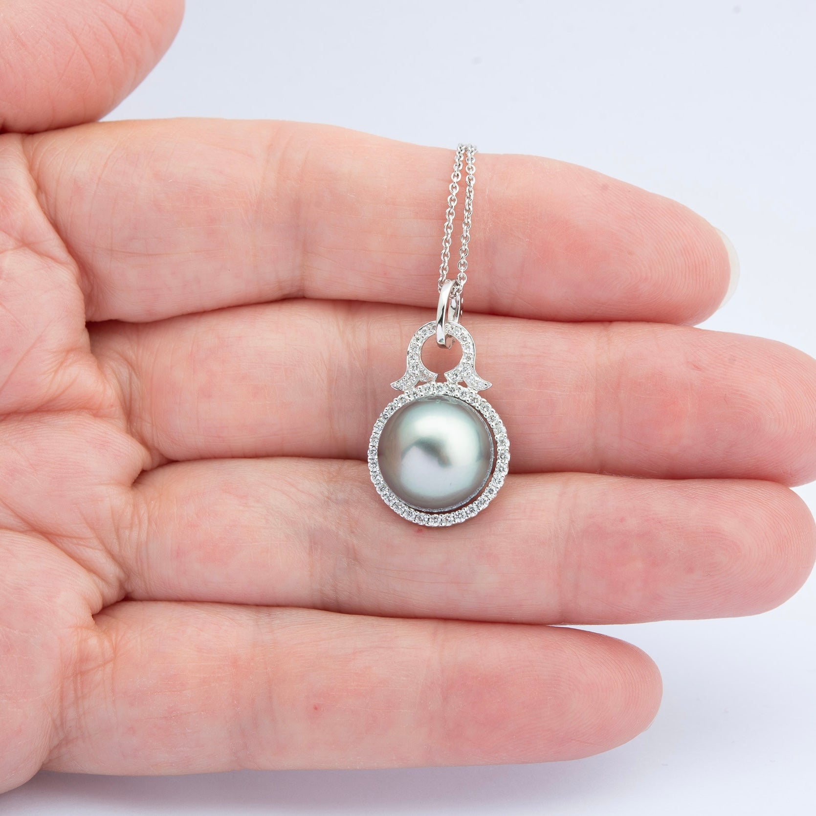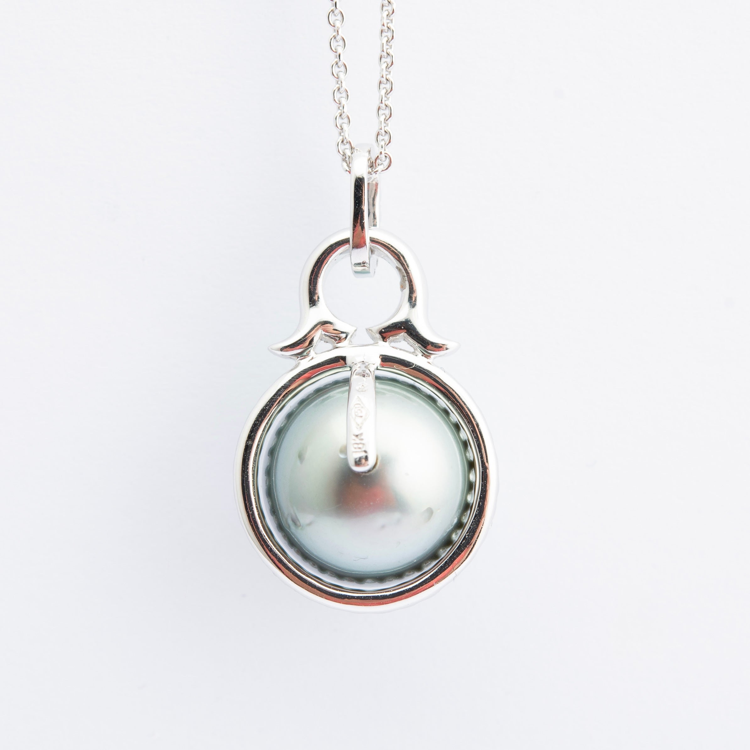 A very elegant vintage pendant featuring a beautiful fine quality lustrous dark grey Tahitian cultured pearl measuring 12mm diameter surrounded by 0.46 ctw natural brilliant diamond halo set in and an 18ct white gold frame. Looks lovely on a simple chain.