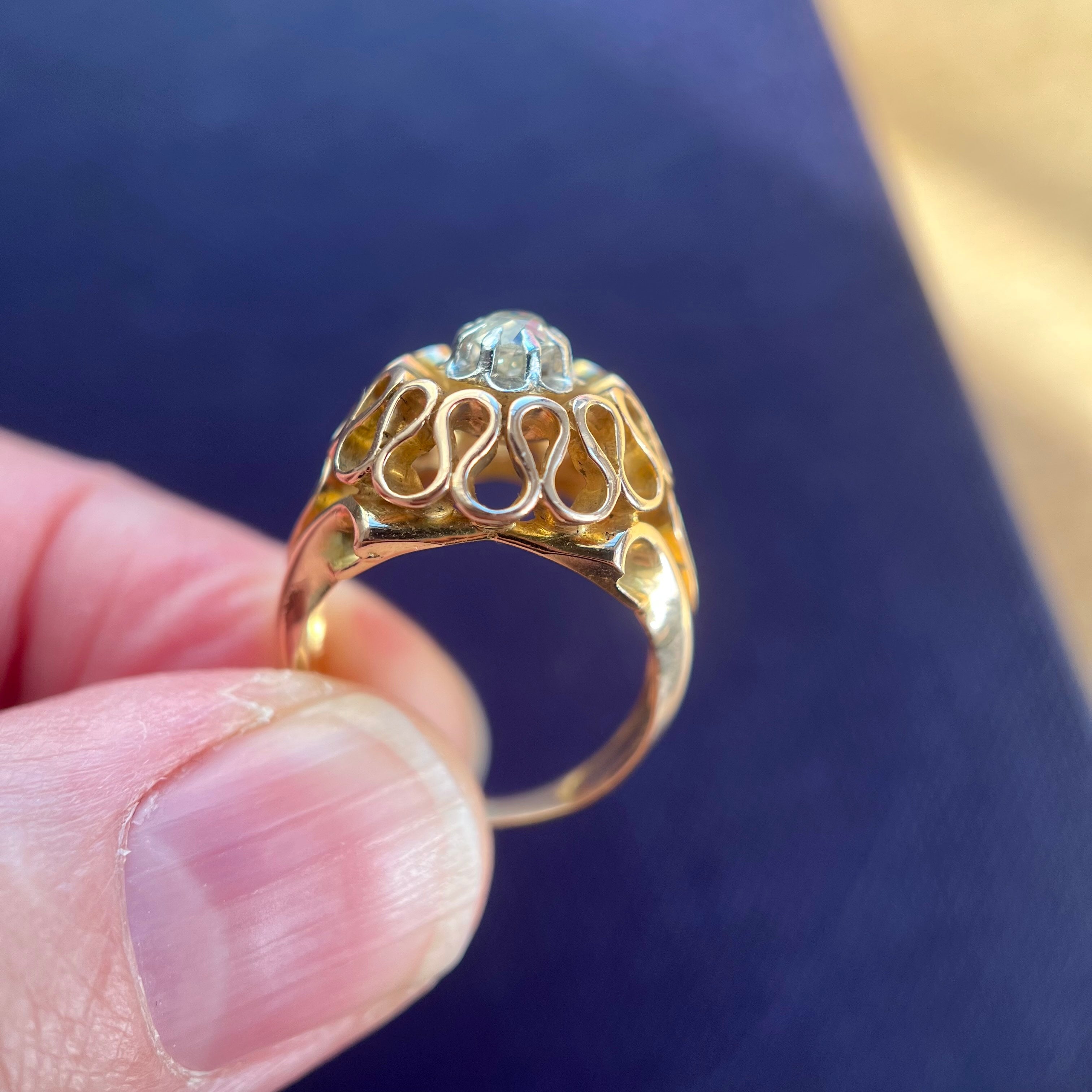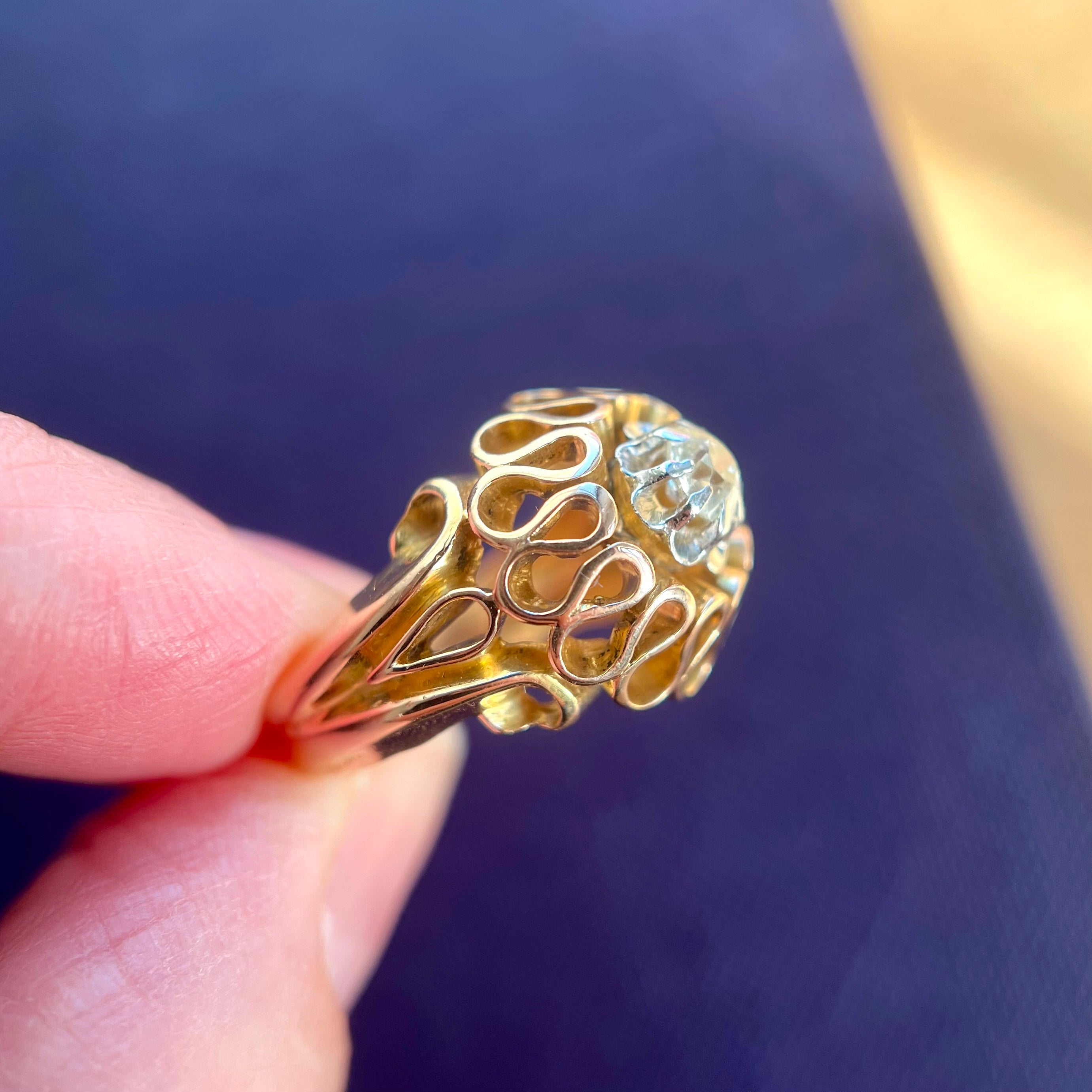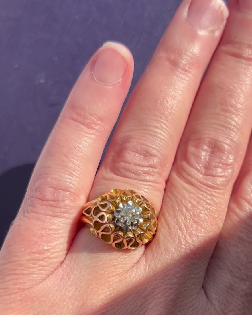 Superb Retro ring, dating circa 1950s, beautifully handcrafted in 18ct yellow-reddish gold and Platinum. In an abstract floral motif reminiscent of the Dahlia flower, featuring a central bright old cut diamond weighing approx. 0.35 carat, set in a Platinum butter cup setting, making the diamond appear larger than it is. This unique ring is in very good condition, sits very elegantly on the hand, looks good on the pinky too.