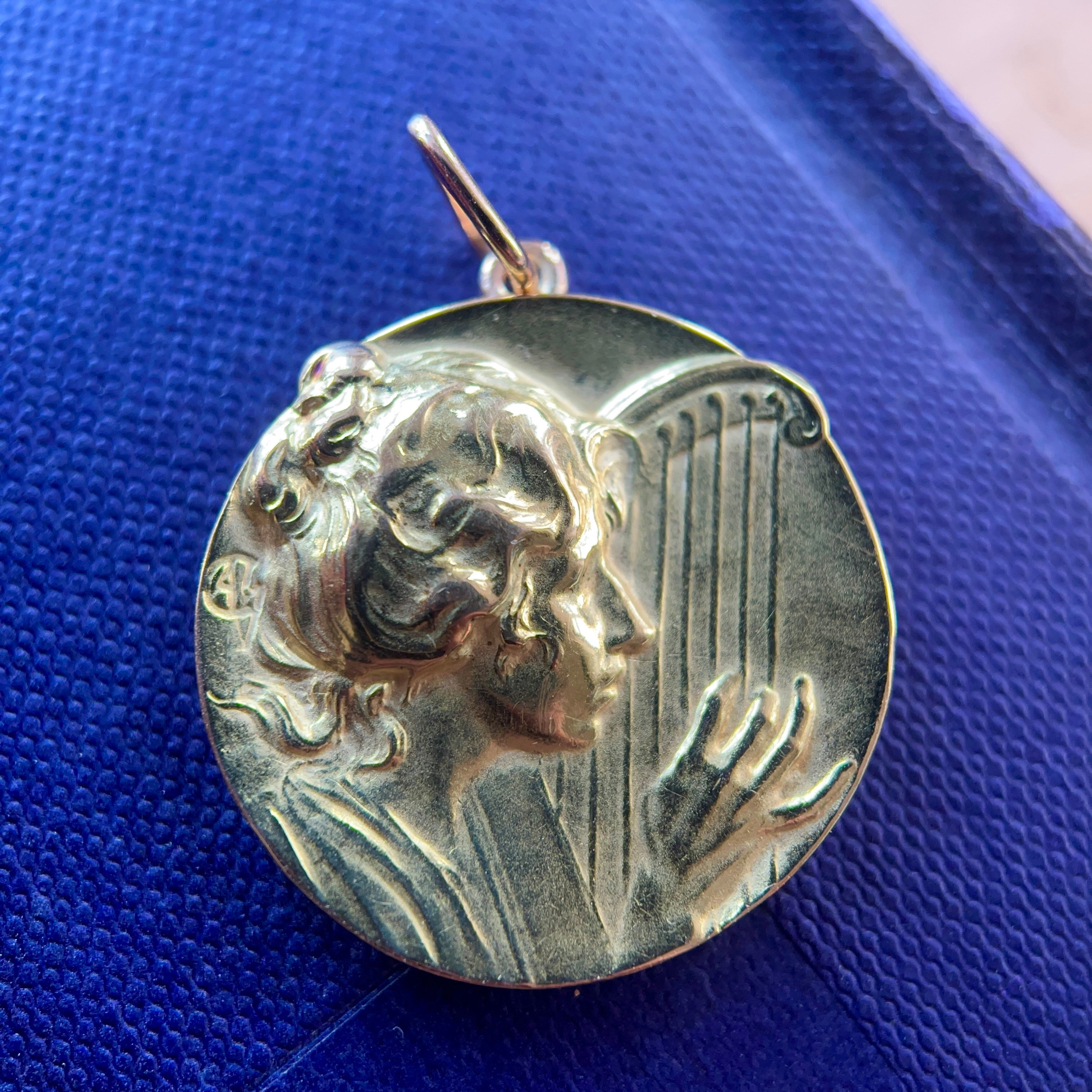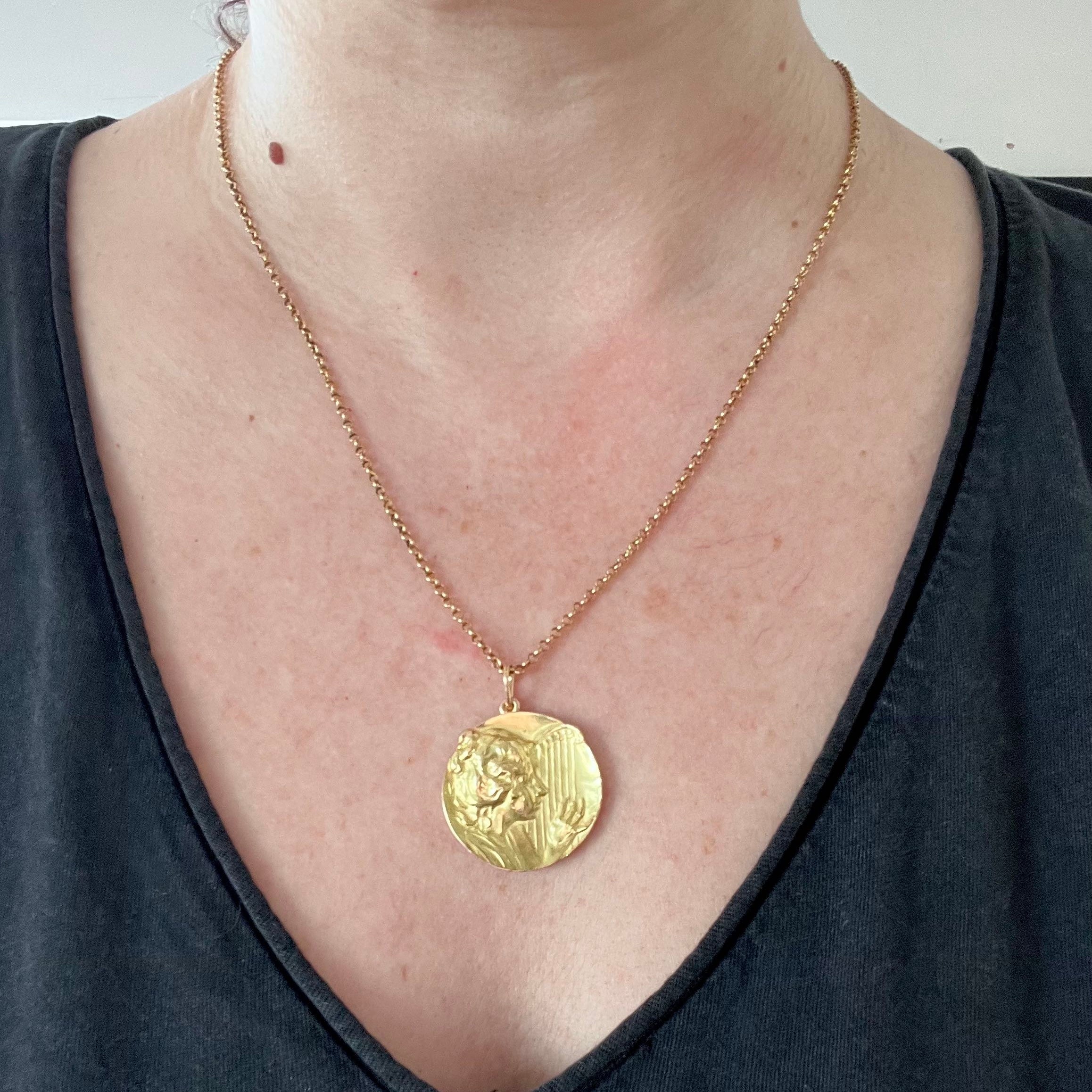 Superb Art Nouveau pendant, dating circa 1900, beautifully crafted in 18ct yellow gold, depicting a young woman’s profile playing the harp. In very good condition, looks fabulous worn on its own or stacked with other pendants.