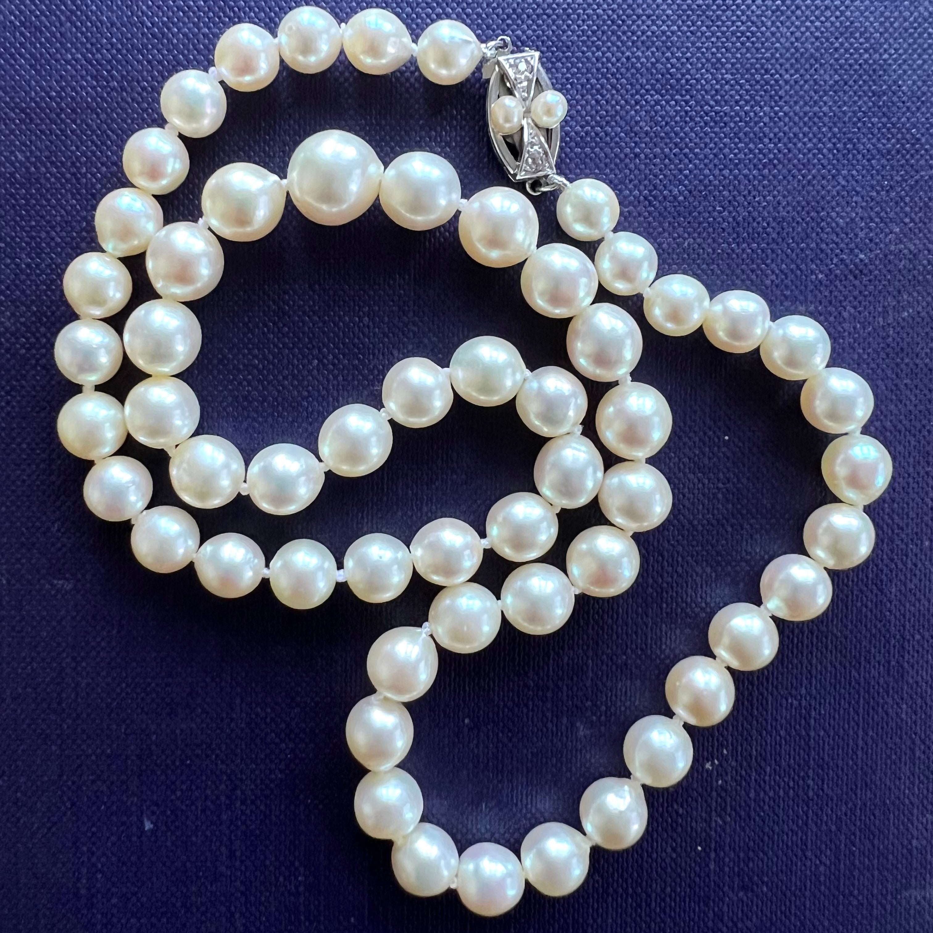 Superb 1920s, Akoya cultured salt sea, pearl necklace containing 57 lustrous very light creamy color, well matched, round pearls of very fine quality, freshly knotted. The 3 larger front pearls are measuring 10mm and 8.5mm, graduating down to 6.6mm-6.7mm diameter terminating with an Antique Art Deco clasp in Platinum set with 2 old cut diamonds approx. 0.03 each and pearls 2 pearls measuring 3.6mm diameter.