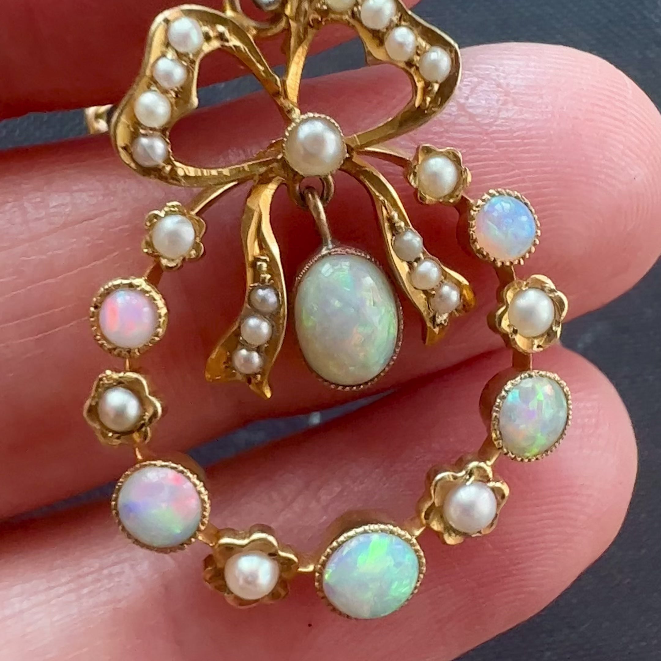 Elegant Edwardian lavaliere pendant and chain, dating circa 1900s, finely crafted in 15ct yellow gold in a wreath motif with a pretty bow and an articulated oval cabochon opal at the centre, set throughout with opals and split pearls in fine millegrain borders. The lively opals display flashes of blue, red and green and contrast well with the pearls. This lovely pendant in very good condition, the antique chain is made in 9ct gold. A very charming necklace.