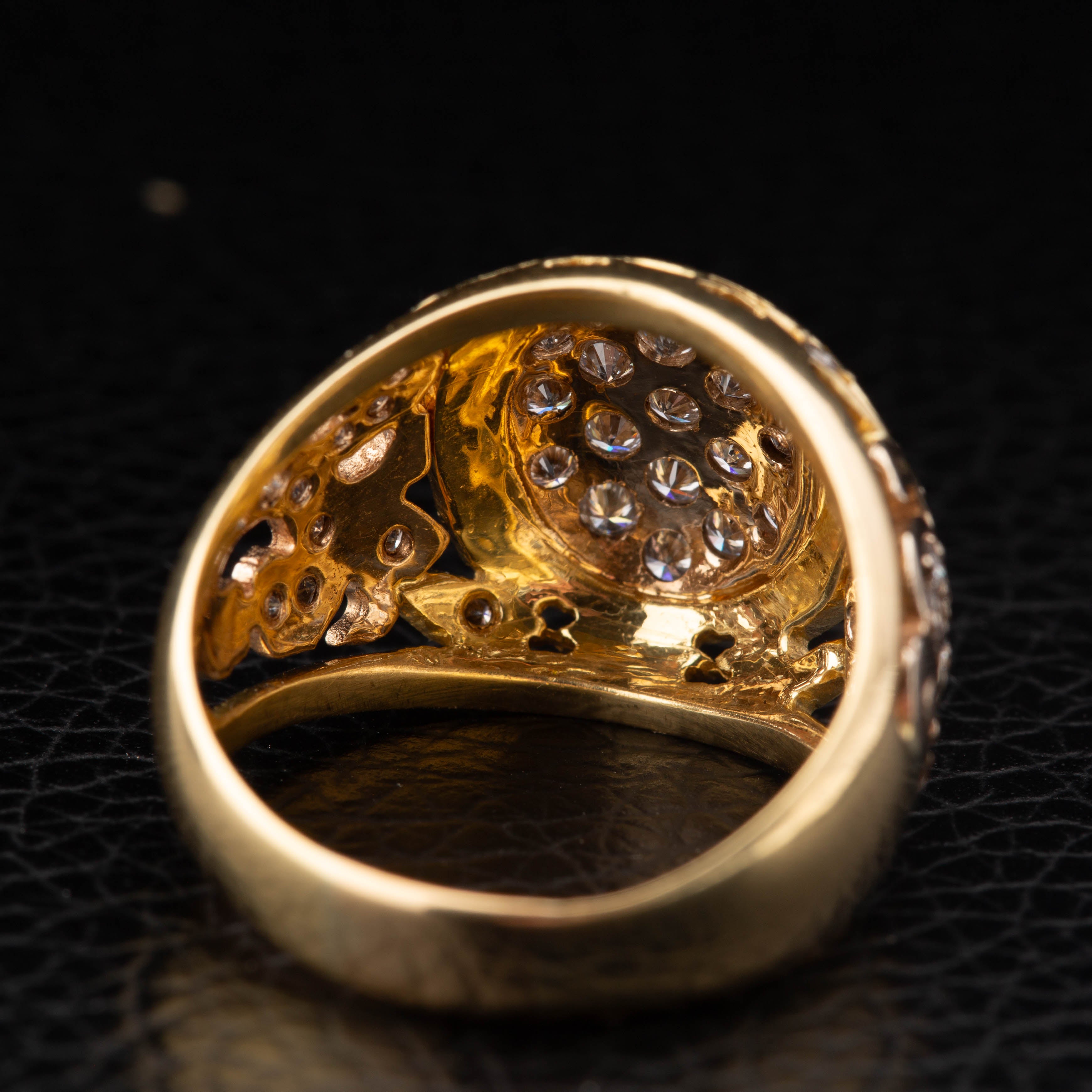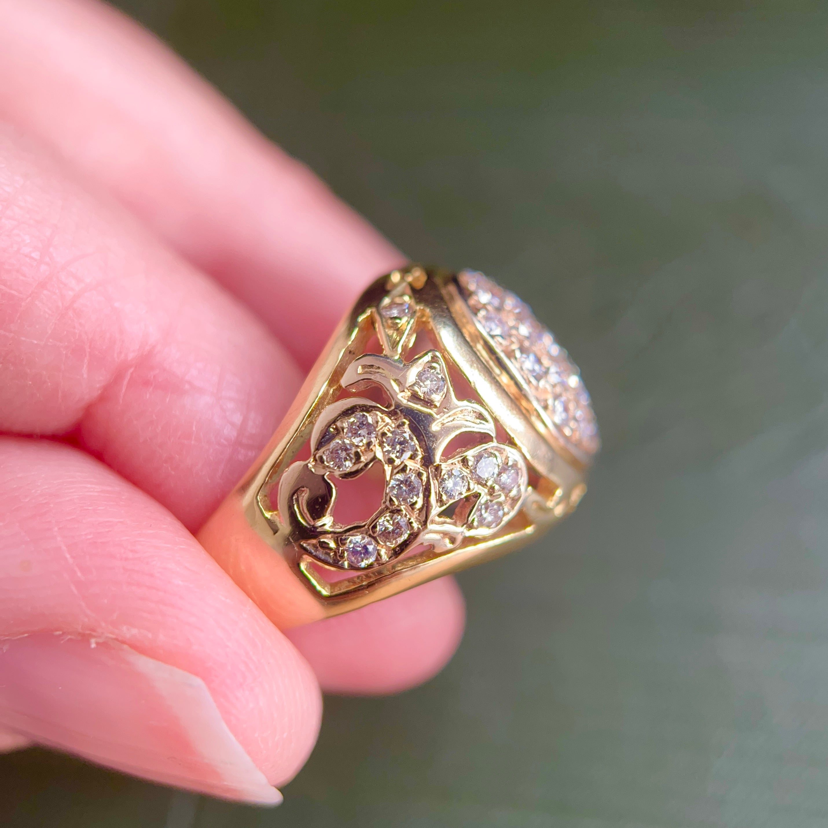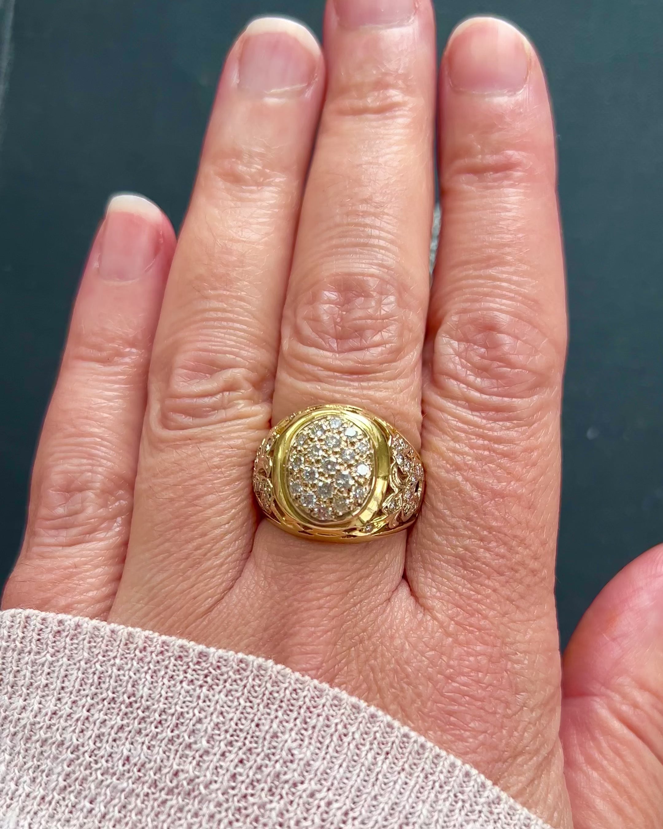 A gorgeous vintage dome shaped pave diamond ring, made in 18ct yellow gold set with 43 round brilliant cut diamonds weighing together approx. 1 carat. The shoulders are beautifully decorated with petal motifs and further encrusted with diamonds. This chunky ring sits beautifully on the hand and would embellish any outfit day or evening.