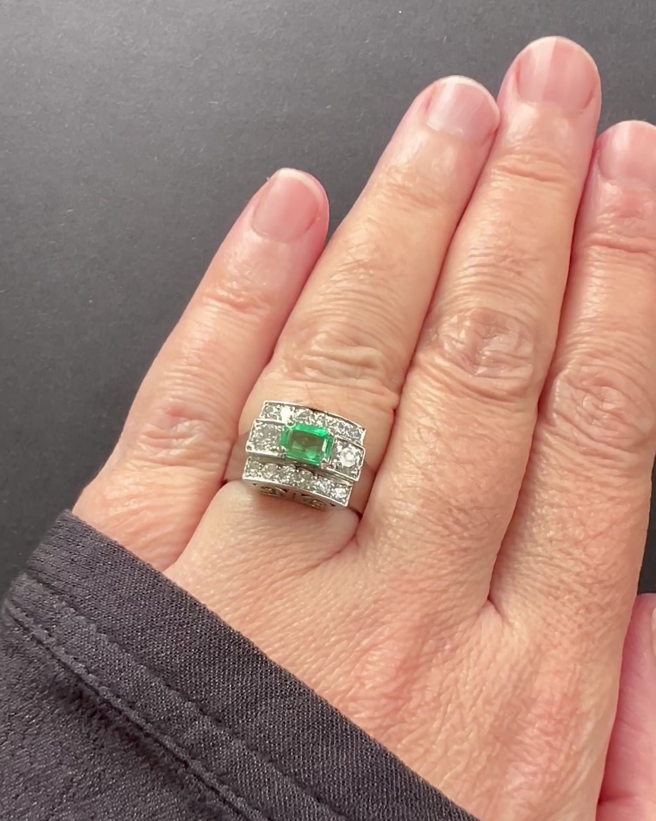 A fabulous Art Deco style ring, handcrafted in 18ct white gold, dating circa 1980. The central lively green Emerald is flanked but two brilliant diamonds, weighing approx. 0.35 ctw, and is further framed by 12 brilliant diamonds. This vintage ring has been crafted in a typical Art Deco geometric style, the basket is further embellished with Fleur de Lis detail. This ring is in very good condition, it bears Swedish hallmarks. Look fabulous on the hand, a one of a kind.